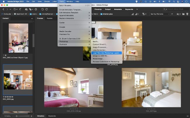 This handy command saves lots of time whenever you need to open several versions of an image into one document, such as when you’re focus-stacking or making a triptych. Simply highlight the set of images in Bridge then go to Tools > Photoshop > Load Files Into Photoshop Layers.