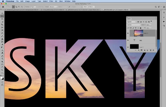 One of the easiest ways to make a composite is simply to clip one layer the shape of another. This is often used to confine images to text like this. Simply hold Alt and click the line between the two layers in the Layers Panel to create a clipping mask. The shape or text (the ‘container’) should be on the lower layer, and the image that you want confined to it should be on the layer above. You can clip multiple layers to one shape if you like.