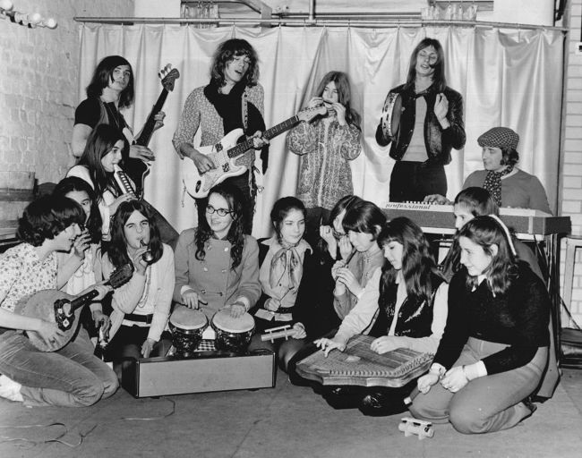 The choir of a girls’ school appeared at the Roundhouse Theatre in London with Kevin Ayers And The Whole World in 1970. Mike Oldfield is on the left.