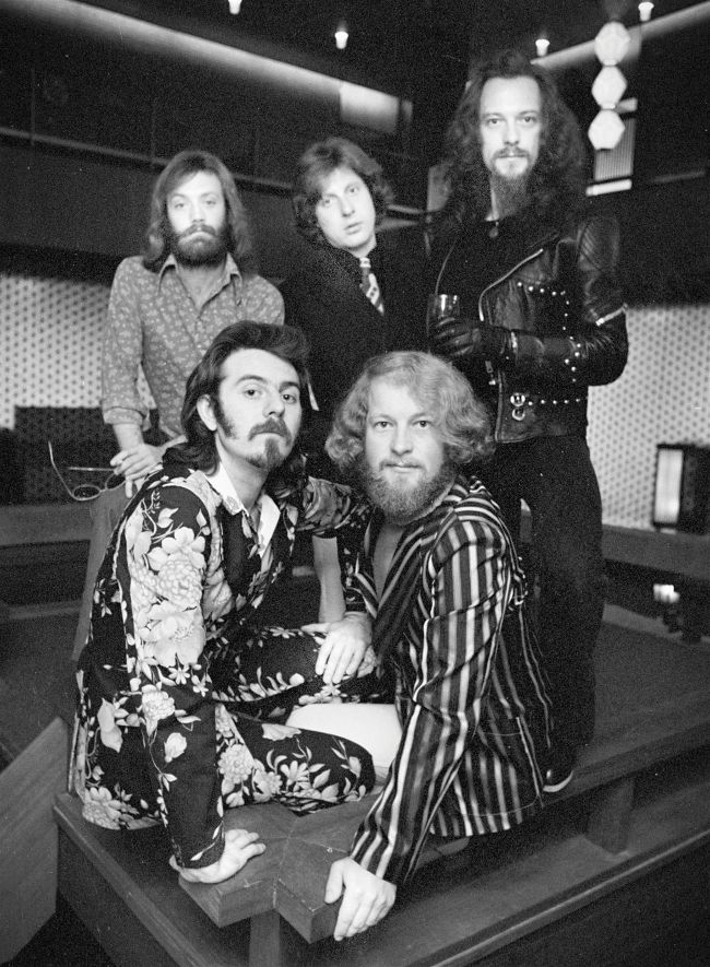 Jethro Tull in Amsterdam, Netherlands, October 12, 1974. Clockwise from back left: Barrimore Barlow, John Evan, Ian Anderson, Martin Barre and Jeffrey Hammond.