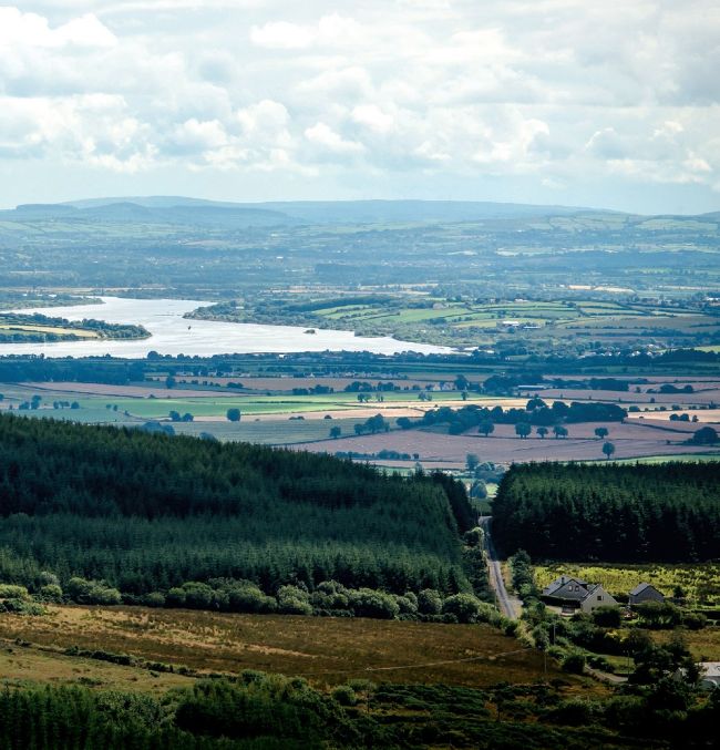 A view of the river Foyle, from Grianán hillfort, which defines part of the Irish border. Counties Londonderry and Tyrone in Northern Ireland are to the left of the river, and County Donegal in the Republic lies to the right