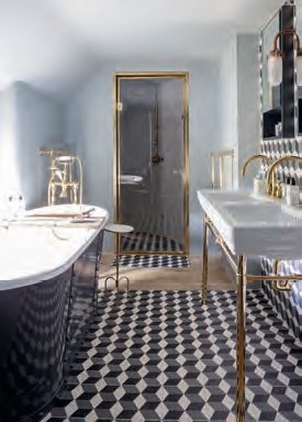 Gleaming brassware stands out against monochrome geometric cement tiles running along the floor and up the basin wall in this project by Gunter & Co. The tiles are from Mosaic del Sur