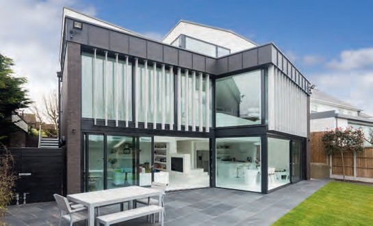 The two-storey facade of this replacement dwelling features faceted windows that open up views of Epping Forest from the first floor bedrooms, whilst minimising overlooking.
