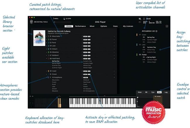 Habitat operates within OT’s SINEplayer plugin format, providing layering between synthetic and electronic sounds, and orchestral instrumentation. The brief for this suite is to create interesting textures and pads, but with an earthiness and degree of control that allows the user to sculpt the musical form very easily.