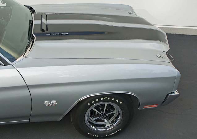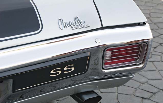 The rear end shows off dual exhaust tips and the resilient bumper insert. Note SS identification subtly added on the passenger side. Desirable, yet rare Cowl Induction hood option included hood pins.