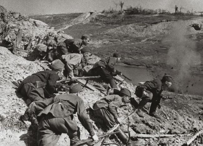 Red Army troops attempt a counter-attack against a German position outside Leningrad