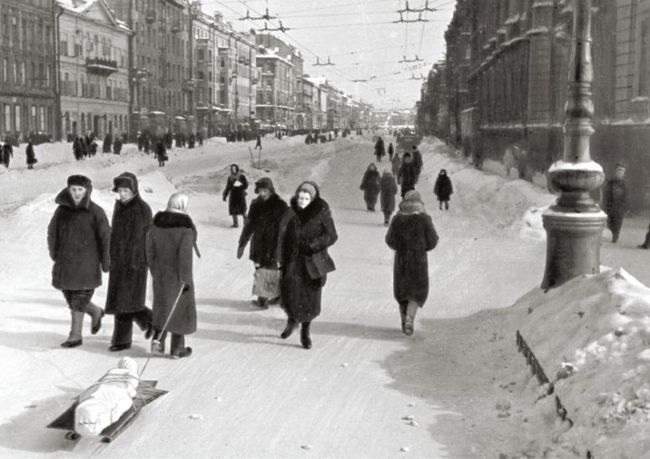 Leningraders, one of whom is pulling a corpse, on Nevsky Prospect during the brutal winter of 1941-42