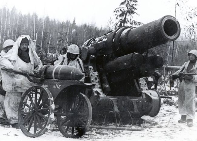 Soviet troops load heavy artillery in 1943, likely with a shell produced by a Leningrad factory