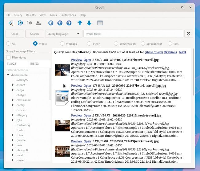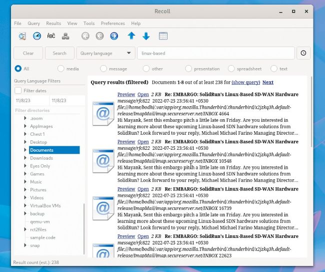 The find command is pretty handy for finding files embedded in your filesystem. Even if you don’t want to get down to the CLI, most modern file managers have a find function that’s dexterous enough to get the job done. But neither of these offer the functionality you get with Recoll, which can dig up documents based on their content, even inside email attachments and compressed archives.
