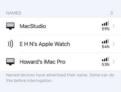 > Our favourite is George Garside’s Bluetooth Inspector, which will scan and interrogate the devices it finds, and displays their percentage signal strength even in its free version. In-app purchase of its more sophisticated Pro version adds features including the sending of messages, detailed logs, and background scanning.