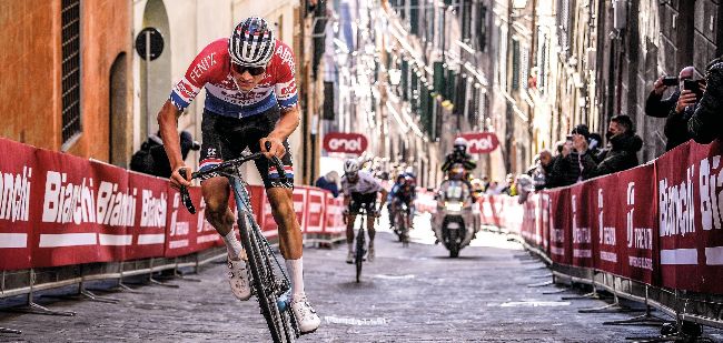 A Van der Poel is streets ahead of Alaphilippe and Bernal on the final climb to Siena