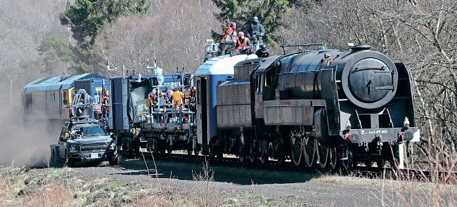 Filming Mission: Impossible 7 near Levisham on April 22 with the replica BR Pacific loco at the head of the train. CHRIS PLAYFAIR