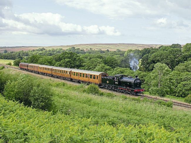 STEAM ON THE MOORS North Eastern Locomotive Preservation Groupowned ‘J27’ 0-6-0 No. 65894 hauls the teak carriage set and a maroon BR Mk.1 through Moorgates on July 4, with the penultimate North Yorkshire Moors Railway service of the day to Pickering.