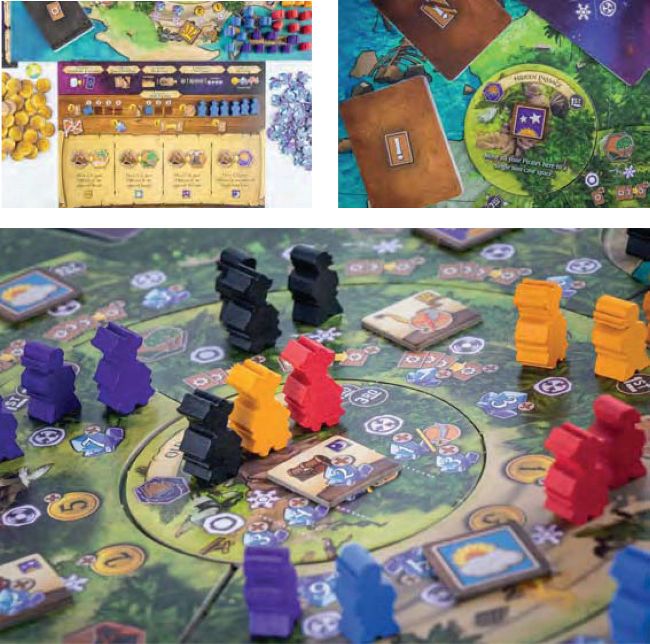 That is the exciting premise of Chrono Corsairs; a twisted mash up of Time Bandits and Groundhog Day spilled out across a colourful modular board. At its heart, Chrono Corsairs is an area control game. Players will spend turns attempting to amass groups of pirates within the island’s several regions, with treasures being rewarded to whoever holds the majority. Treasure largely consists of doubloons and time gems – a mysterious resource that presumably holds the key to escape – with the latter being sought for end game scoring. Along the way, traps will be sprung, and game changing artefacts will be unearthed, giving players more options for traversing the island and ambushing their opponents.