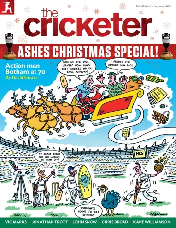 The wonderful cover of the January issue of The Cricketer is from celebrated illustrator Nick Newman, teeing up the Ashes and Christmas. Look out for Ben Stokes, Pat Cummins, Joe Root, Ian Botham and Glenn McGrath.
