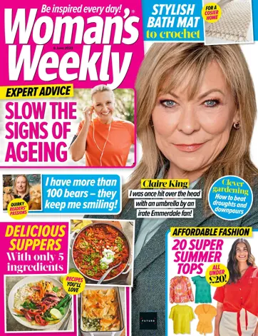 Get hooked on the latest issue of Woman's Weekly! Discover how to crochet a stylish bath mat, whip up delicious suppers with only 5 ingredients, and read about Claire King's run-in with an Emmerdale fan. Plus, find quirky reader passions, affordable fashion, clever gardening tips, and expert advice on slowing the signs of ageing.