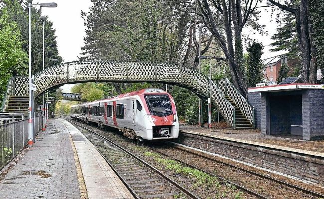 Transport for Wales‘Flirt’No. 231010 slows for a stop at Hengoed on November 1, while working the 2R12/13.03 Penarth to Rhymney. The former high level line through the village from Pontypool Road to Neath ran on the bridge behind the unit until closure in June 1964.