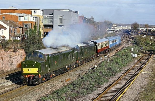 Class 37s Nos. D6851 (37667) Flopsie and D6817 (37521) open up as they head south-west from Eastleigh on November 3, hauling Mk.1 No. 3140, Mk.3 No. 41162 and HST power car No. 43049 Neville Hill as the 5Z43/10.00 Eastleigh Arlington to Crewe via Salisbury, Bath and Hereford on November 3.