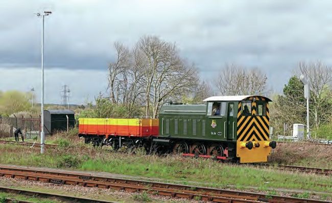 Having shunted Lowmac wagon No. 42193, Great Western Society-owned Hunslet 0-6-0DM No. DL26 is seen returning with ODA pipe wagon No. 113026 on April 4.