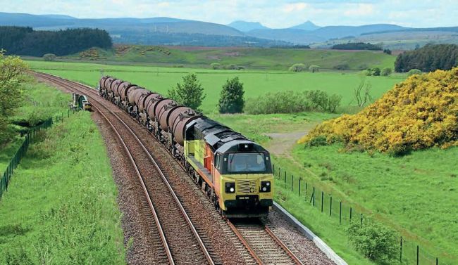Scotland’s five-year plan for rail calls for a 10% rise in freight carried. On June 2, 2022, Colas’s No. 70802 runs north near Blackford (Perth and Kinross) with the 10.17Workington to Aberdeen empty calcium carbonate tanks.