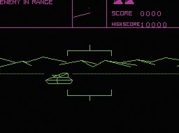 Despite a necessary change of colour scheme (the original’s powerful reds replaced with a rather more flowery magenta), this version is extremely competent, moving at a decent pace and containing everything from the arcade game save an animated volcano and crescent moon. It’s just a shame Realtime’s 3D Tank Duel had already beaten Quicksilva to the punch.
