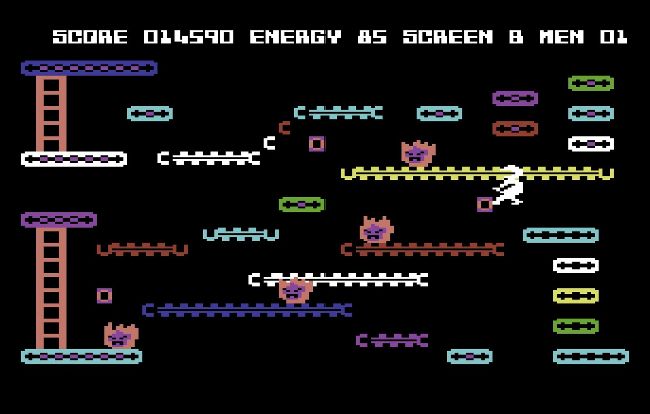 » COMMODORE 64 » 1984 » RON ROSEN I really have a fondness for singlescreen platformers, and since the style was at its peak in the Eighties, it’s almost inevitable that I’ll end up playing one whenever I break out an 8-bit computer. I think part of it is just because I like to put myself in the shoes of the game designer when I play them. One of my favourite quotes is from the veteran Magic: The Gathering head designer Mark Rosewater, “Restrictions breed creativity.” I wonder how I would tackle the task of creating interesting and varied challenges within the limitations of a single screen?