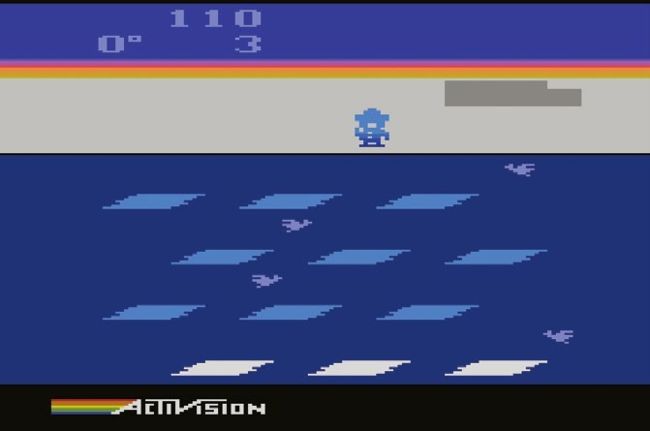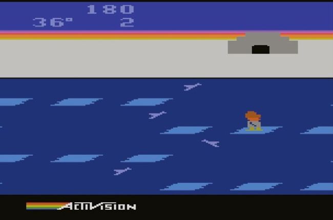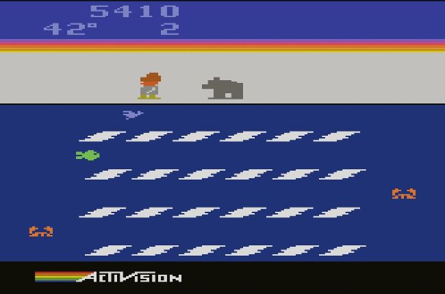 Frostbite, he combined aspects of bothQ*bertandFroggeralong with some fresh ideas of his own. The end result sees you changing the colour of floating ice blocks in order to build an igloo while avoiding the attentions of local wildlife. The frozen cubes move in opposite directions, like the detritus in the ponds inFrogger, and animals swim and fly alongside them. These push you into a watery grave if they make contact, so a fair amount of jumping around is required. To make matters worse,Frostbite’s later levels introduce hungry bears that run after the game’s Eskimo protagonist when he tries to enter a completed igloo, and finally, if the temperature reaches zero degrees before he does so you lose a life.
