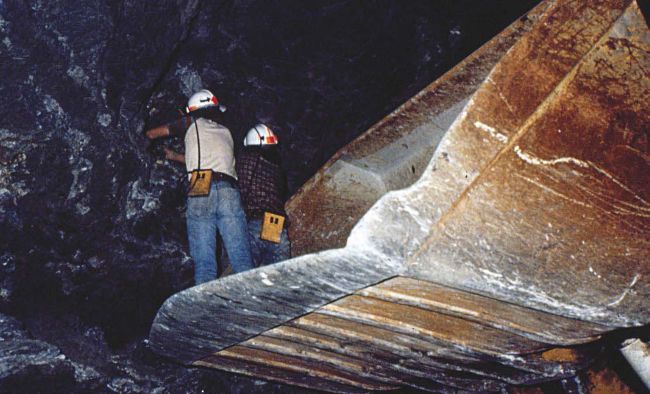 Chris Panczner and Evan Jones collecting stibnite in Mexico’s San Martin mine while standing in the bucket of a front loader bulldozer.