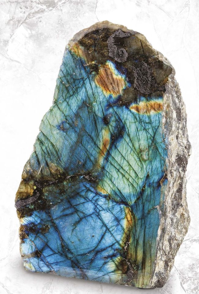 The remarkable play of colors seen in massive labradorite is predominantly blue, but flashes of bronze, golden, red, green and yellow show up as a piece is rotated or moved under a strong light source. Both exciting massive and gemmy types of labradorite can be self-collected. Outcrops of massive labradorite are found in a host of countries, including the United States, where it has been mined as a decorative stone for carvings and less often for jewelry.