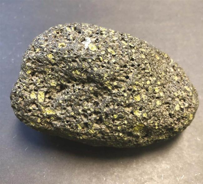 One of Clark’s favorite rocks: this basalt is from Hawaii. It’s very rare to have large green olivine crystals (the gemstone peridot) in a basalt like this one has. Also, the reason it is round is because it has been shaped by the ocean waves.