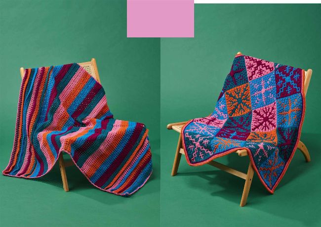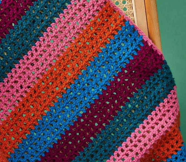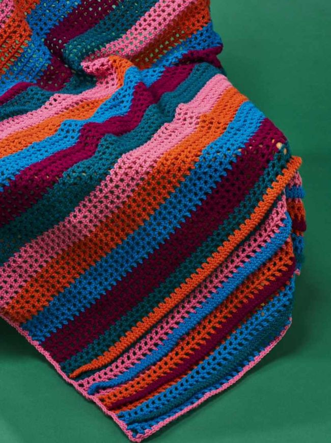 Left to right: Joanne had a no-fuss project in mind when she designed her blanket – the result is this mesh fabric worked in trebles, chains and skipped stitches; change colour every four rows to create the striped pattern, then finish the blanket with surface crochet on eight of the rows