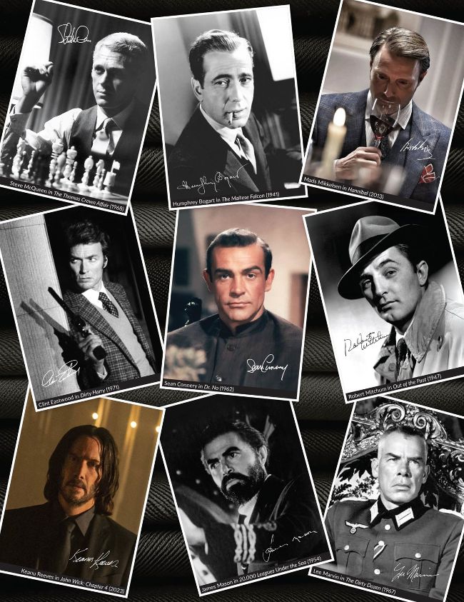 Indeed, most cinematic heroes have proven so dull—both sartorially and psychologically—and out of touch with increasingly cynical times that antiheroes have often stolen the spotlight, whether intentionally or not. Think Bogart’s Sam Spade, just about every Bob Mitchum character, Steve McQueen, Lee Marvin, and Clint Eastwood, whether as the “Man with No Name” (with Lee Van Cleef’s Col. Douglas Mortimer as a darkly cool supporting antihero) or “Dirty Harry” Callahan. Add to the list James Bond in his many incarnations and, more recently, Keanu Reeves’s John Wick—four times over. These cynics, with their sharp skepticism, exude competence, class, and above all, cool. Far from Homecoming Day heroes, they embody the invented pop-psychology “Sigma Male” archetype—if it were ever real to begin with. And made up it was.
