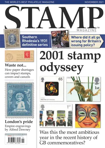 In our November issue we look back 20 years, to 2001, to reveal how Britain’s special stamp programme that year was among the most radical and innovative ever, with new design approaches and printing techniques coming thick and fast. We also investigate the dramatic affect of paper shortages on postal communication worldwide, with results which have affected the way letters are written, the way envelopes are used, the way stamps are printed and the way mail is cancelled. Amongst our regular features, Commonwealth Classics recalls the 1931 definitives of Southern Rhodesia, while Great Engravers celebrates the impact of Alfred Downey on stamps of the British Empire. The final instalment of our Black Magic series investigates why most Penny Blacks were rejected for postage if damaged, yet some got through. Our news pages explain why the British Indian Ocean Territory might now be a ‘dead country’, and we have full details of Royal Mail’s DC Collection set. Our comment pages contain plenty of reaction to the current way in which British stamp issues are conceived and marketed.