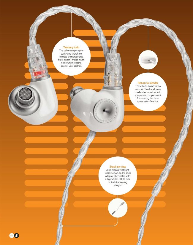 M eze is no stranger to wired headphones that demand four-figure sums, but at just €159 the Alba in-ears are chump change in comparison. On paper it doesn’t seem any corners have been cut: the glossy zinc alloy buds are more distinctive than some costing much more; and while there’s only a single dynamic driver inside each one, that alone isn’t an indicator of sound quality.