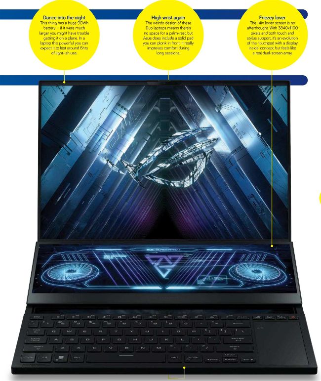 Want to feel like you’re sitting at a control centre, not just a laptop? The Zephyrus Duo 16 fits a dual-monitor setup into what on the outside looks like a pretty traditional design.