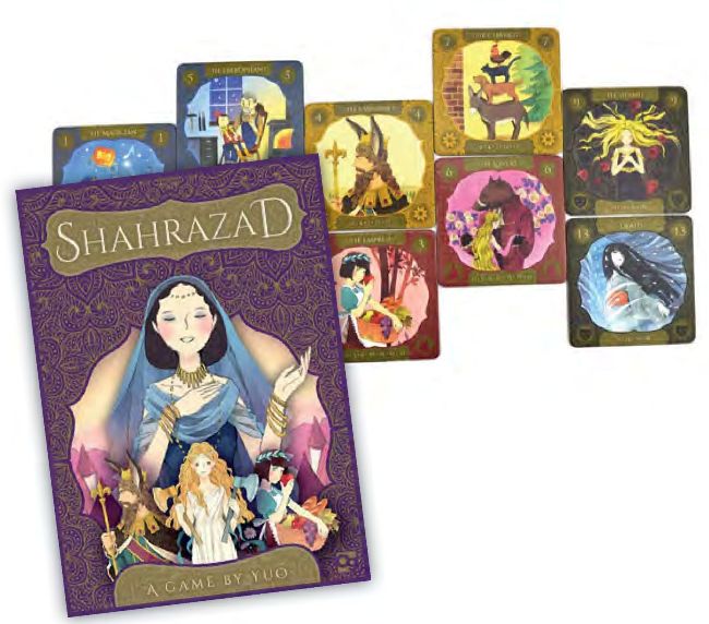 Shahrazad is a beautiful game. From the finely-textured box to its 22 gorgeous oversized tiles, each featuring a different mythical or fairy tale reference, illustrated by artist Kotori Neiko, there’s no doubt that this revamped version of designer Yuo’s Tarot Storia more than looks the part. The problem is the beauty only goes skin deep. Shahrazad’s title refers to the 1001 Nights character who tells stories to a bloodthirsty king to spare her life. The game takes this setup and attempts to apply it to a simple tile-laying mechanic, where all of the squares must be arranged from left to right in ascending numerical order and placed adjacent to matching colours in order to gather points over two rounds.