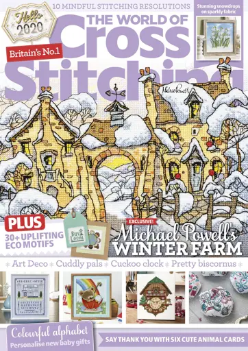 Jan 2020 Our brand-new edition of The World of Cross Stitching is bursting with new season stitching treats for you to enjoy. Meet our cover star this month – a stunning wintry landscape, designed by the talented artist, Michael Powell. See in the New Year in style with Emma Congdon’s glitzy party set and after the festivities, don’t forget to thank family and friends with Jenny Barton’s adorable woodland animal cards. Learn some new stitches in 2020 with Faby Reilly’s set of pretty biscornu pincushions and follow our simple instructions to stitch and make your very own working cuckoo clock! There’s also prizes to win, the latest stitchy news and expert advice.