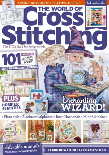 Your brand-new digital edition, issue 323 (Sept 2022) of The World of Cross Stitching is out now and it’s packed with 101 patterns to enjoy! Conjure up an enchanting wizard, personalise a set of anniversary cards, relax into a serene portrait, create uplifting abstract art, stitch a blackwork sunflowers alphabet and try a Rosh Hashanah design to celebrate the Jewish New Year. Plus, find expert stitchy advice, prizes to win and more!