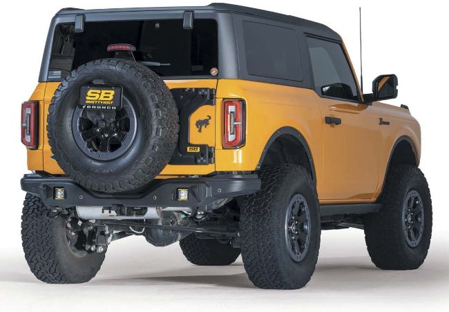 Being able to carry an oversized spare tire on the exterior tailgate is important, and the new Smittybilt Bronco HD Pivot is up to the task. Made of monoblock aluminum material, the single-action component bolts on quickly and easily, strengthening the tailgate while allowing up to a 40-inch spare. The tire mount is adjustable, thanks to chromoly mounting brackets, and maintains the easy, single-action opening and closing of the tailgate. The auxiliary accessory mount eliminates tailgate sagging and rattles that would likely occur with an oversized tire attached to the stock bracket. The design allows the third brake light and backup camera to continue to function with the oversized tire in place.