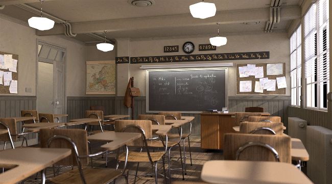 This classroom scene is perfect for volumetric lighting, with light streaming in through the windows