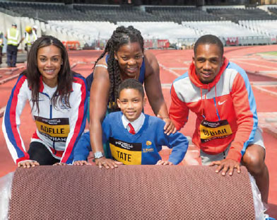 Adelle Tracey and CJ Ujah with Tate and Simone Sharpe as the new all-weather track in the Olympic Stadium is laid for the Great Newham London Run in July