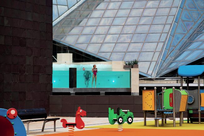 I took this while sitting on the bank of a playground close to Caldea (a thermal spa located in Escaldes-Engordany, Andorra). The lady is looking at the river passing between the playground and the swimming pool. The picture has not been retouched – the man’s head doesn’t accompany his body due to refraction.
