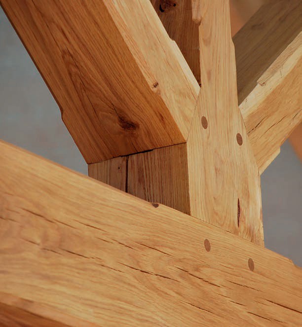 Exposed oak beams are a wonderful way to add warmth and texture. To the right is a king post truss, jointed with traditional pegged mortice and tenons as part of a project by English Brothers. The characteristic cracks are developed as the wood dries and hardens - a process which actually strengthens the structure. You don’t have to go for a full green oak frame, as feature beams can be incorporated into pretty much any project to get the traditional look on a more limited budget.