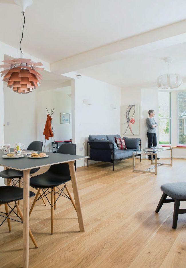 A dividing wall was replaced by a steel beam so that the ground floor rooms could be opened up into a light, spacious dining-sitting room. A second steel allows for a wide opening from the hall. Light pours in from all angles via windows to the front, back and sides of the property