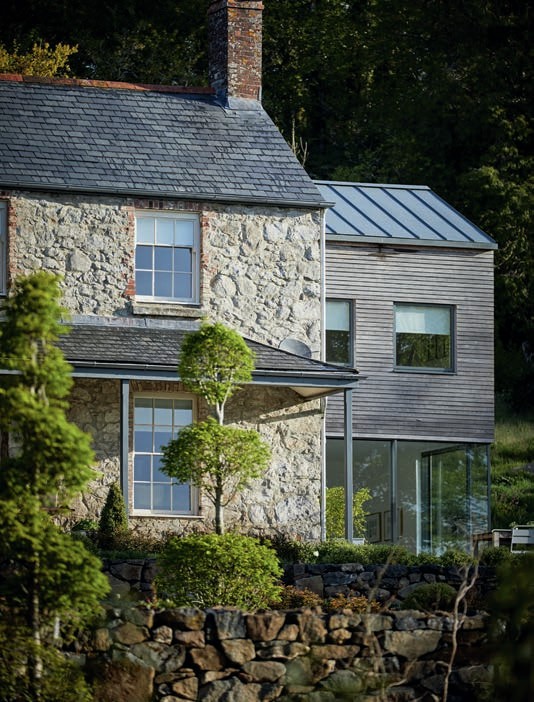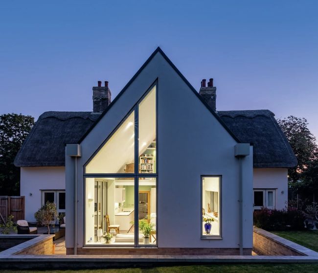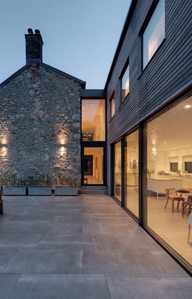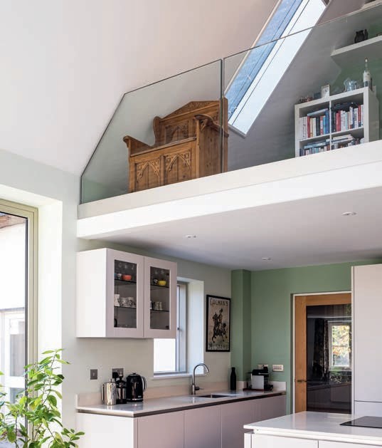 Located in a small Cambridgeshire village, this property was formerly four small agricultural cottages that have been altered, adapted and combined over time to create one larger building. Snell David Architects sought to reimagine the home and make it fit for modern family life. They demolished the existing rundown flat roof extension and replaced it with a new double-height addition that features sharp, full-height glazing. Inside, a mezzanine gallery overlooks the open-plan kitchen-diner and provides perfectlyframed views through to the garden while rooflights overhead flood the space with natural light. (www.snell-david.co.uk)