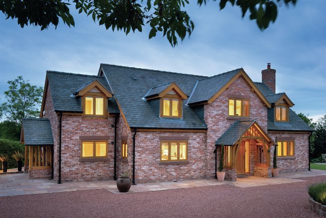 Above: This new home by Welsh Oak Frame (welshoakframe. com) features a traditional look from the front, including slate roof tiles across the roof, pitched dormers and porch