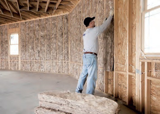 Knauf’s mineral wool insulation being installed between timber studs. If needed, a service void can be battened out