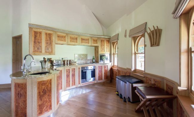 John created the curved kitchen cabinetry himself, using oak frames and burr yew panels for each unit. The worktops are made from granite