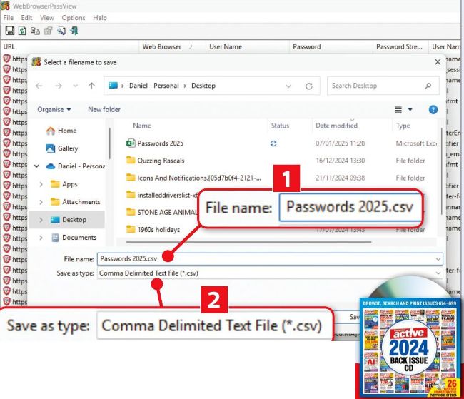 To do so, press Ctrl+A to select all the passwords, then click File at the top left followed by Save Selected Items. Now give the file a suitable name ( 1 in our screenshot) then save it as a Comma Delimited Text File 2 , which has the file extension .csv. This will save it as a spreadsheet using your default office tool. Now choose where to save it, then click Save to confirm. And that’s it – job done!