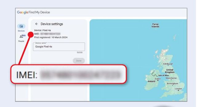 If your phone is an Android model, you should visit Google’s Find My Device page (www.snipca.com/54798), then click the cog icon. You’ll see the IMEI listed under ‘Device settings’ (see screenshot). You can also do this with iPhones, as long as you previously registered it. Sign into the Apple ID site (https://account.apple.com) and click Devices. But you’ll need to type a code that gets sent to another trusted device.